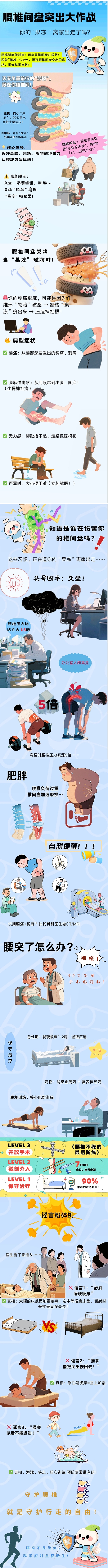 用拟人化“椎椎小卫士”“果冻髓核”“轮胎纤维环” ,把专业医学知识转化为直观形象,降低理解门槛。通过场景化插画,如久坐办公、弯腰搬重物,呈现致病诱因;以人物动作、表情,展现腰痛腿麻等症状,让抽象医学内容可视化。
