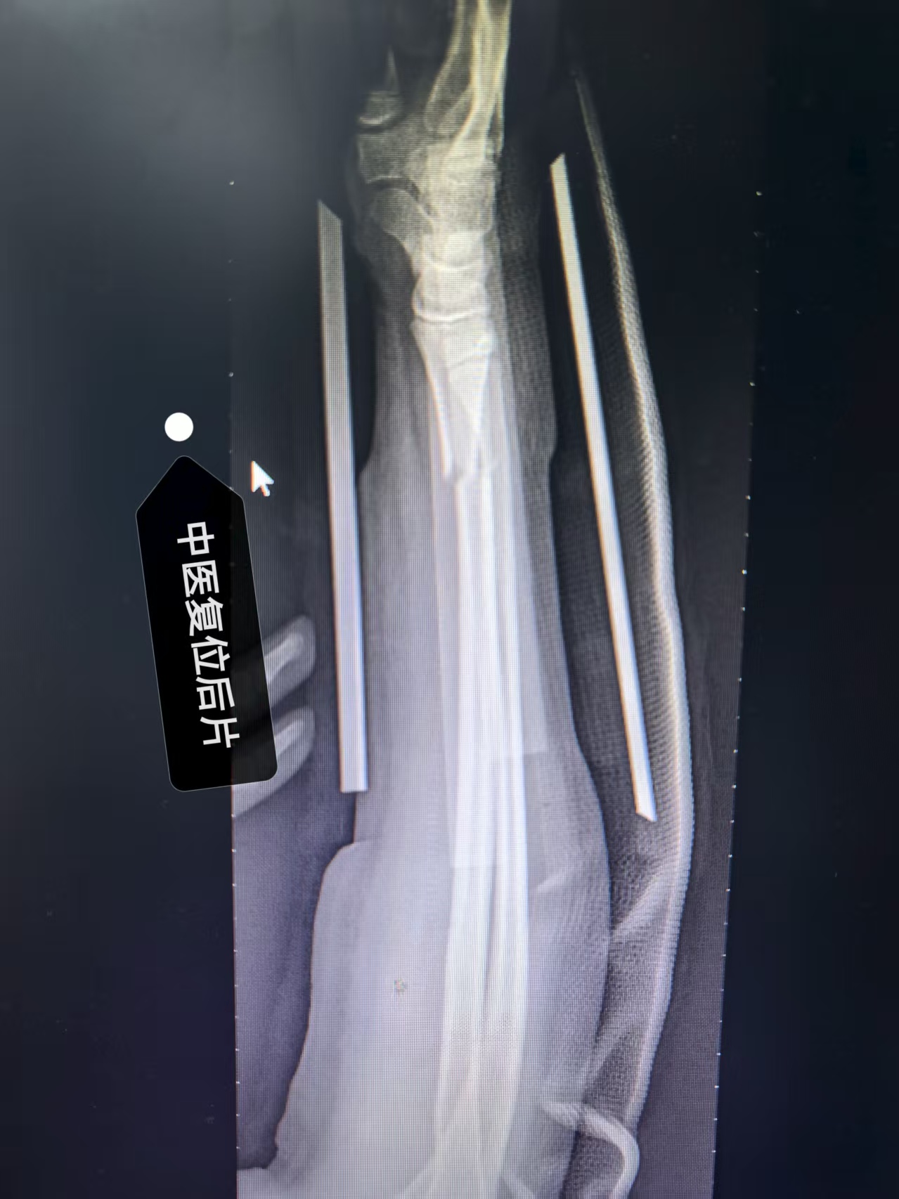 1、精细研究,精准复位。经验丰富的中医骨科专家运用传承千年的汉派中医正骨手法,凭借双手精准的触感和对骨骼解剖的深刻理解,如同施展“魔法”一般,在不开刀的情况下,巧妙地将错位的尺骨和桡骨成功复位到满意的位置。