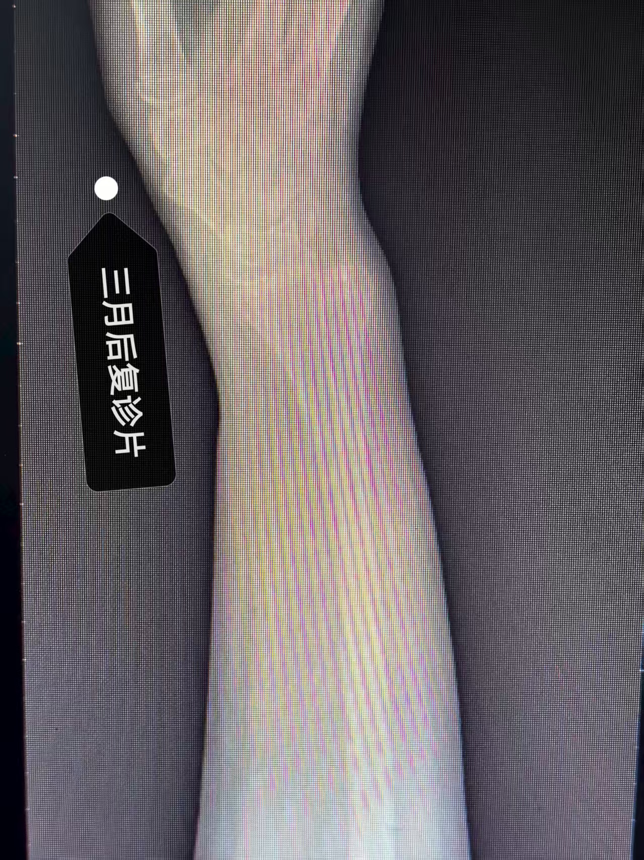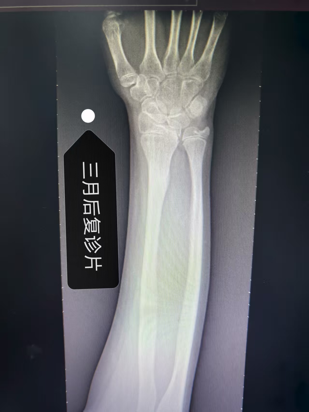 (以上二图,是复位固定三月后复诊的照片,疗效非常满意,骨折基本解剖复位愈合,患儿前臂功能恢复如初,旋转功能良好)