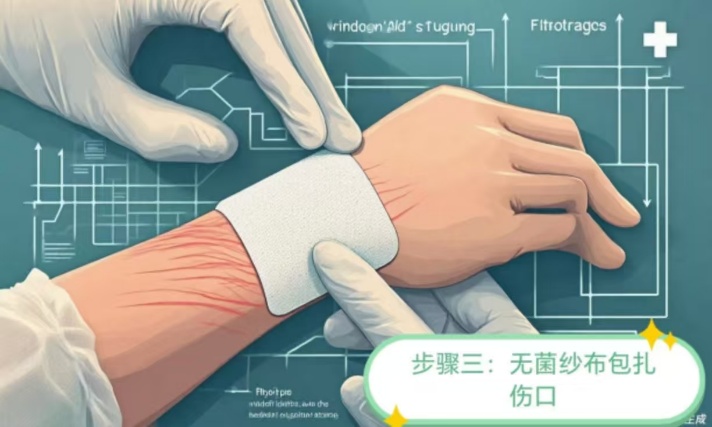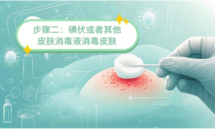 操作细节:用干净的医用棉签或无菌纱布,吸干伤口表面残留的水分和肥皂水,然后取碘伏(优先选择,刺激性小)或 75% 医用酒精,从伤口中心向周围皮肤螺旋式涂抹消毒,消毒范围需覆盖伤口周边 5cm 区域。 注意事项:若伤口较深,可用无菌棉签蘸取碘伏深入伤口内部消毒;消毒后等待药液自然干燥,不要用纸巾或衣物擦拭。 |