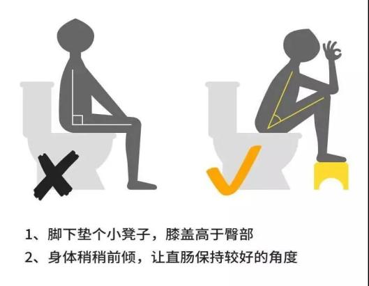 排便时采取蹲位或坐时,在脚下踩一个小板凳,使膝盖高于臀部,模拟蹲姿。这个姿势能增加腹压,利用重力帮助排便。对于行动不便者,可采用左侧卧位。