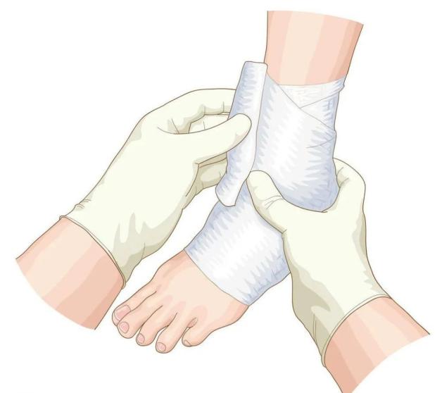 (4)加压包扎(Compression):严重的扭伤加压包扎后能减轻肿胀,防止进一步出血。注意不能揉或者喷红花油、活络油、药酒等,否则会加重急性期损伤小血管的出血,导致肿胀疼痛加重。