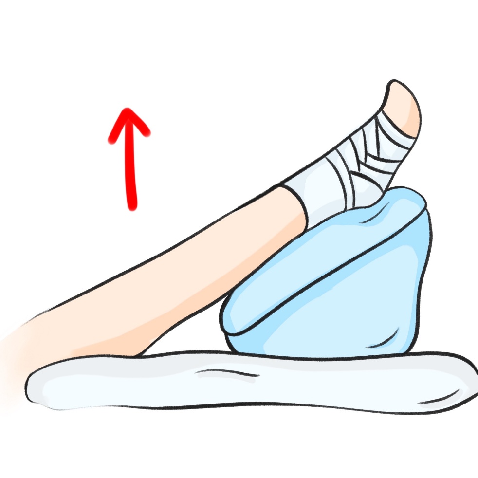 5. E(Elevation,抬高患肢):休息时,将受伤的脚踝加垫抬高,至少超过心脏水平。利用重力促进血液和淋巴液回流,极大帮助消肿。(图4)