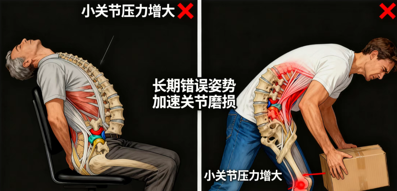2、长期“伤腰姿势”加速磨损:久坐时腰部肌肉放松,上半身的重量全压在小关节上;长期弯腰干活(如拖地、抱孩子)、低头看手机,会让小关节一直处于“紧绷挤压”状态;经常单侧用力(如单肩背包、长期用一侧手撑着干活),会让两侧小关节受力不均——这些姿势都会加速软骨磨损,让炎症提前找上门。
