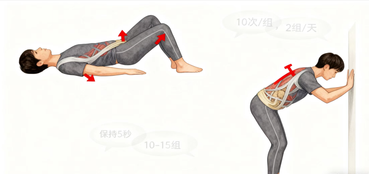 4、长期康复:练“腰部肌肉”,给关节“撑腰”:不管疼痛轻重,都要长期练腰部肌肉——肌肉变强壮了,能分担小关节的压力,减少磨损。推荐两个简单动作: