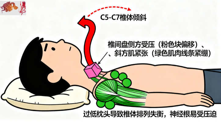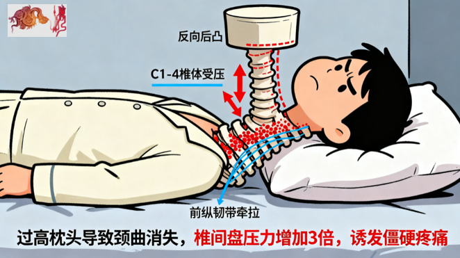 错误用枕过高图,颈曲反向的解剖损伤