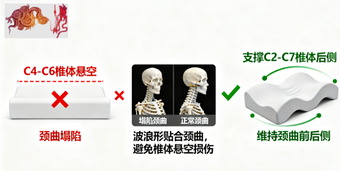 正确用枕形状标准图,突出颈曲贴合与椎体支撑的解剖关系