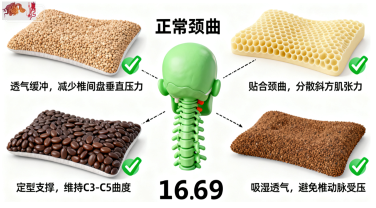 正确用枕材质标准图,结合不同材质的解剖适配优势