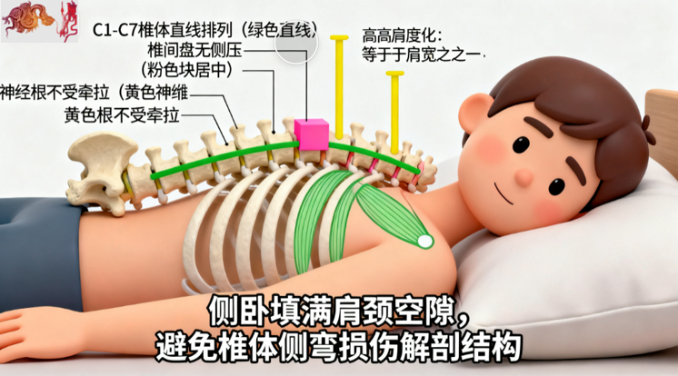 侧卧睡姿图,椎体排列与神经根状态的解剖适配
