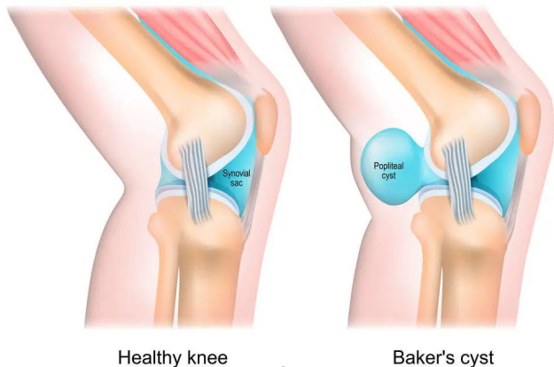 后期囊肿肿大,伴随膝关节的伸展,邻近组织受压可引起膝后方疼痛、膝关节后部肿胀、膝盖僵硬和活动范围减少受限。