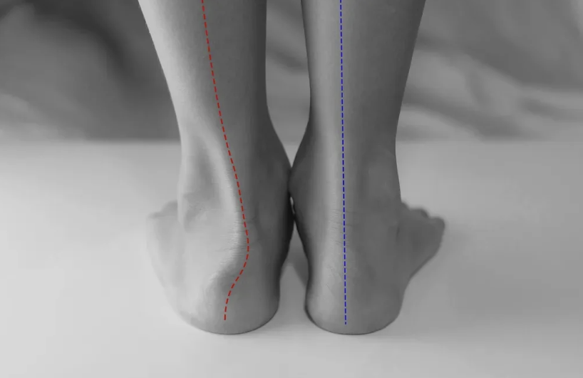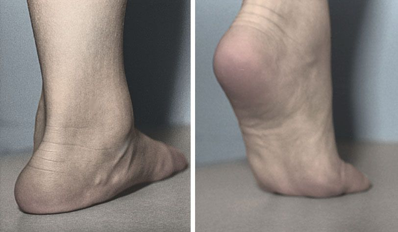 柔性扁平足:外翻站立时足弓消失(左)踮起脚尖时足弓又出现(右)