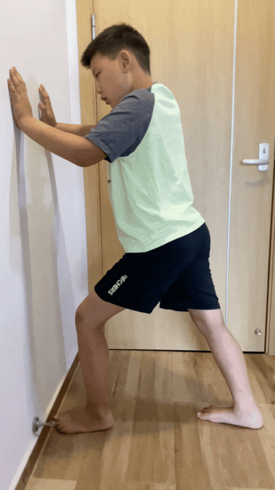 让孩子身体前倾,双手扶墙站立,一条腿在另一条腿前面。伸直后腿,脚跟压地。前腿膝盖弯曲,保持 15~30 秒。双脚脚跟平放在地板上,后脚脚趾朝向前脚脚跟,每条腿做 3 次。