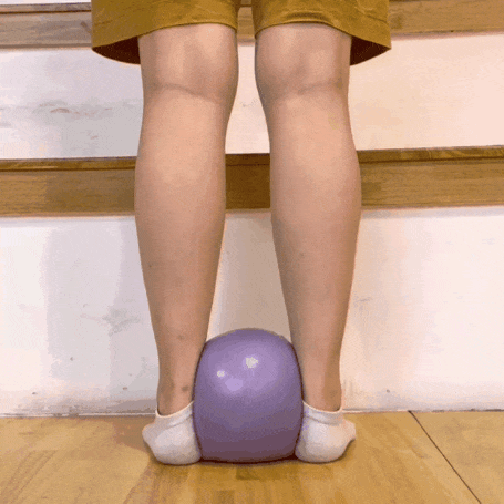 让孩子站立,双脚分开与肩同宽,选择一个和双脚间隙大小差不多的球夹在双脚之间,然后踮起脚尖,保持 2 秒,再慢慢放下回到地面,确保不要让球从脚踝间滑落,完成 3 组,每组 12 次。