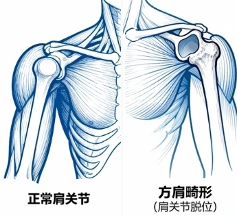 (红色箭头标注为方肩畸形外观;右图左侧为正常肩关节的圆润轮廓,右侧为脱位后肩峰突出的“方肩”形态)