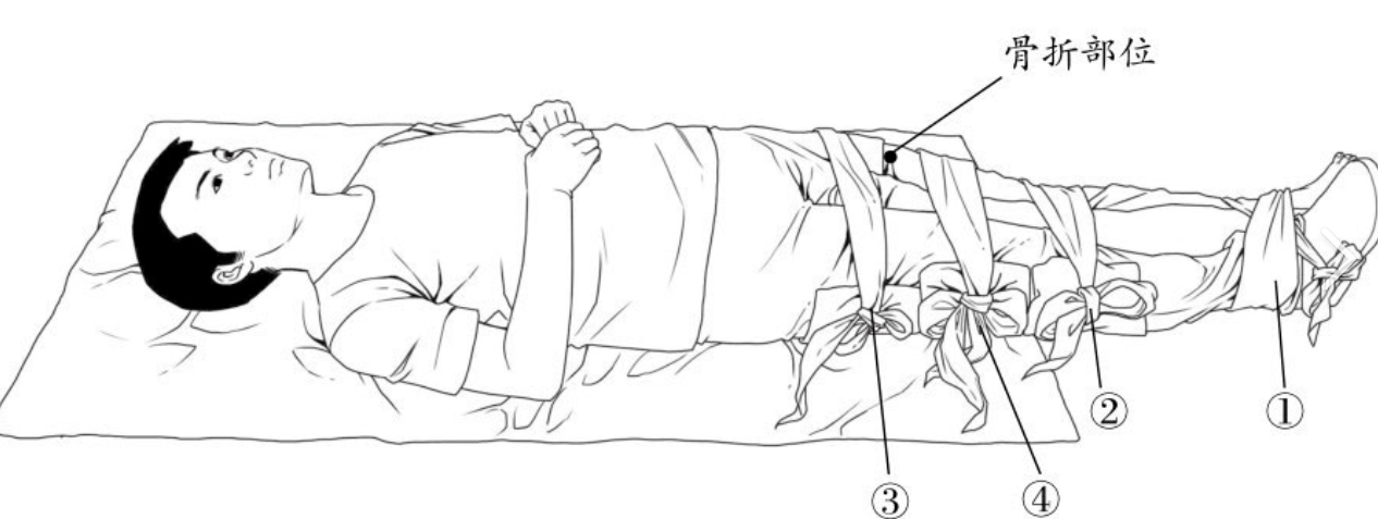 · 将伤腿和好腿绑在一起(好腿就是天然夹板)