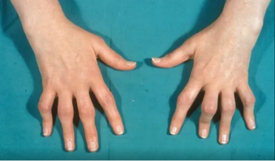 :晚期因软骨、骨质破坏,可能出现 “天鹅颈” 畸形(手指关节过度伸展)、纽扣花畸形,或关节强直、活动受限;