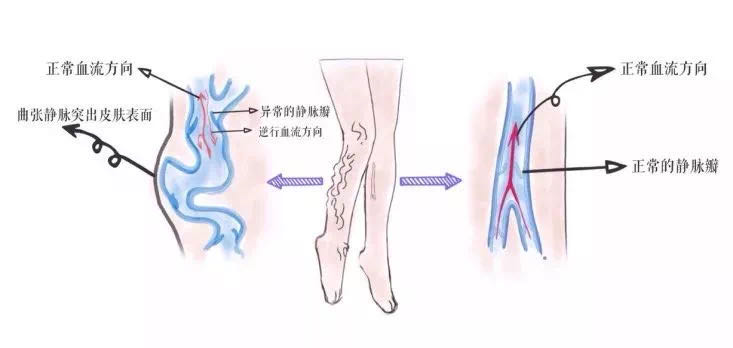 人体的构造非常奇妙,腿部的静脉中有很多“静脉瓣”,像是很多单向阀门,帮助静脉血液回流到心脏,防止血液倒流。但这些静脉瓣会因为一些原因受损,瓣膜关闭不严,造成血液倒流,从而导致下肢静脉血液瘀滞,形成静脉曲张。