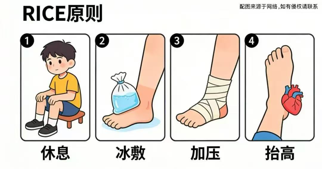 • Rest(休息):立即停止活动,避免负重(别硬撑着走路!)。如果疼痛剧烈,可借助拐杖或他人搀扶。