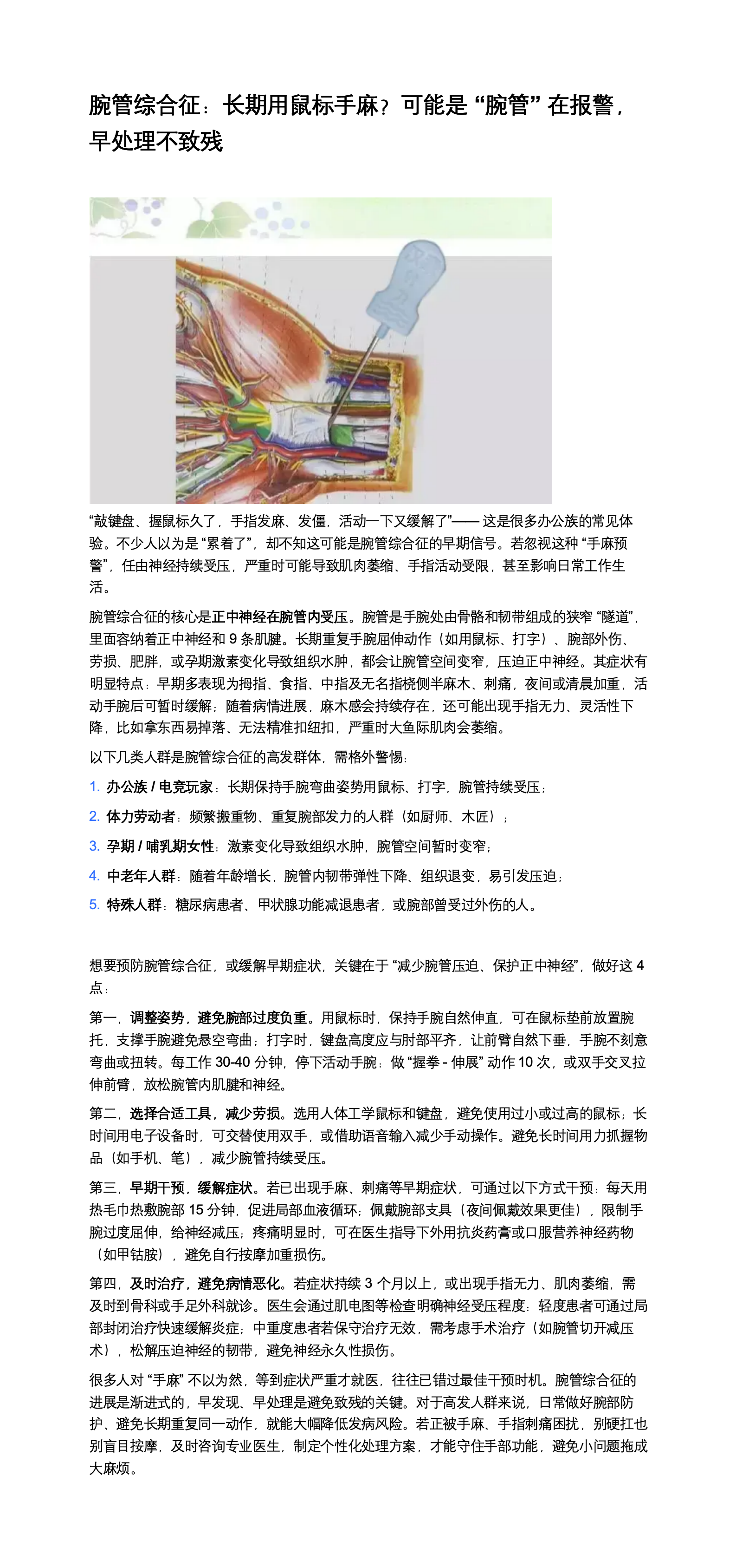 腕管综合征:长期用鼠标手麻?可能是 “腕管” 在报警,早处理不致残