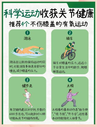 选择温和的有氧运动:推荐进行游泳、骑自行车、散步等对膝关节负荷较小的运动。这些运动能促进关节滑液分泌,营养软骨,同时改善心肺功能。