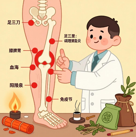 深秋(寒露、霜降):寒湿加重,需着重温经祛寒。可在阳陵泉、膝眼等穴位进行艾灸,或饮用杜仲牛膝汤等药膳,并注意加强膝部保暖。