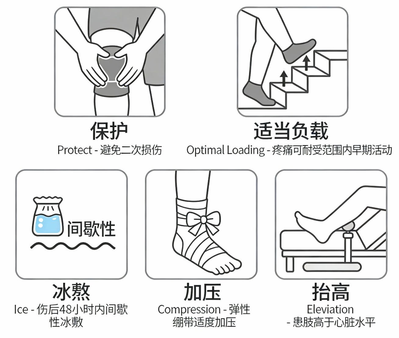 · 冰敷(Ice): 伤后48小时内间歇性冰敷