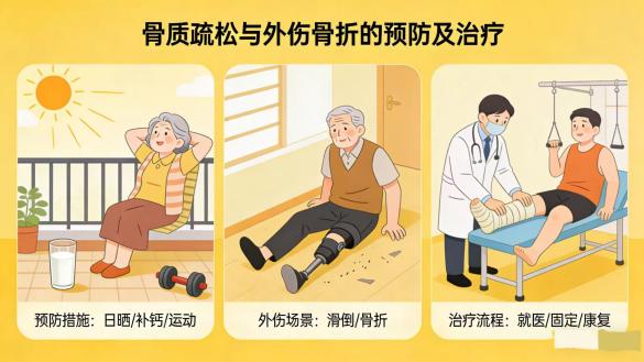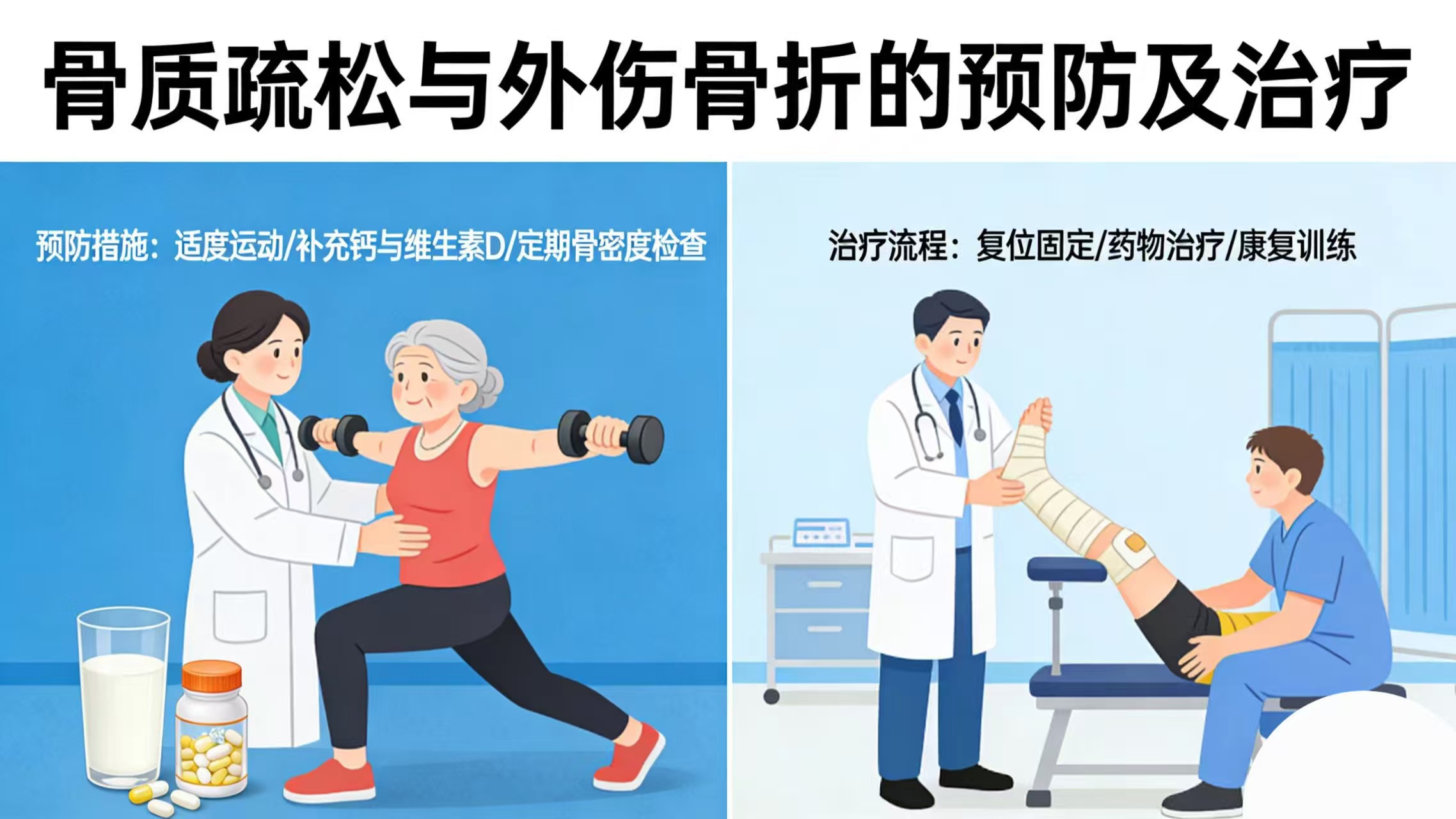 骨质疏松与外伤骨折的防治是系统性工作,日常做好骨量管理和防跌倒防护,能有效降低骨折发生率;骨折后兼顾局部修复与全身骨松治疗,才能实现良好康复,守护骨骼健康。
