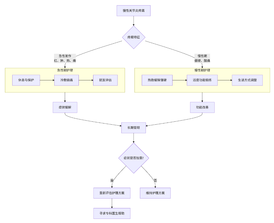 以下流程图展示了慢性关节炎疼痛护理的决策路径,帮助您更直观地理解如何根据自身情况采取相应措施: