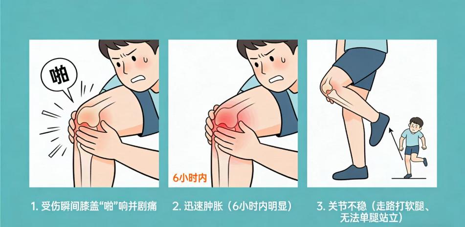 :损伤瞬间突发尖锐疼痛,数小时内关节迅速肿胀,皮下可能出现淤青。