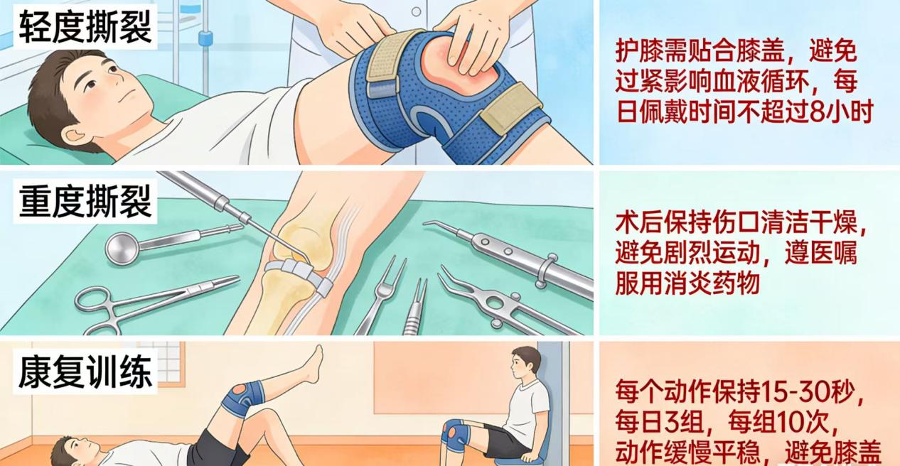 :适用于韧带完全撕裂、关节严重不稳者。通过关节镜微创手术缝合或重建韧带,术后需遵医嘱进行规范康复训练。
