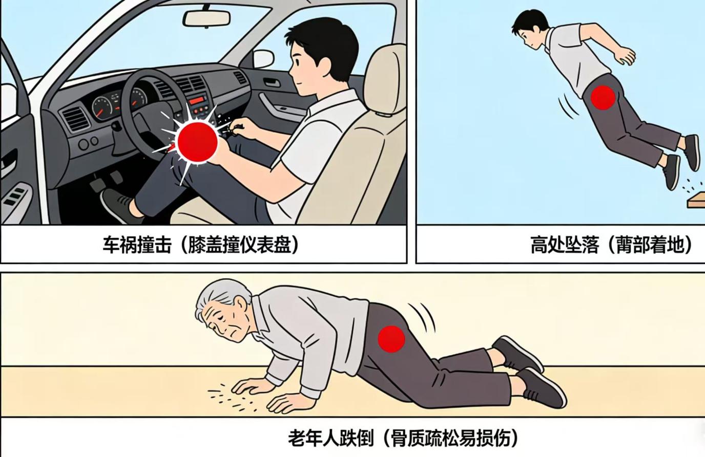 高能量创伤:车祸撞击(如膝盖撞击仪表盘)、高处坠落、重物砸击髋部;