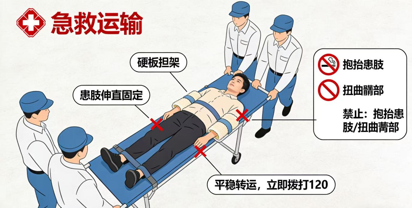 :拨打120,用硬板担架平稳搬运,搬运时保持患肢伸直,避免扭曲髋部。