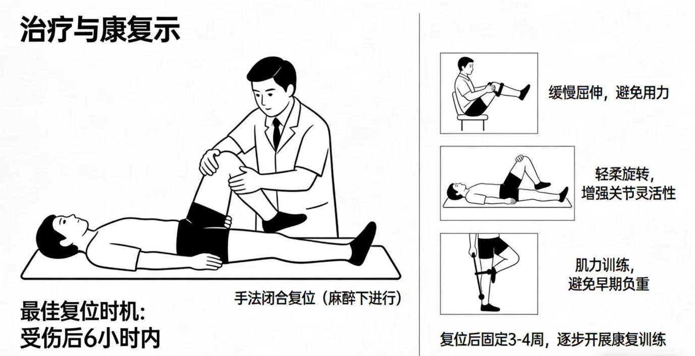 受伤后6小时内为最佳复位时机,医生在麻醉下进行手法复位(闭合复位),将股骨头推回髋臼内;若手法复位失败,需急诊手术复位。