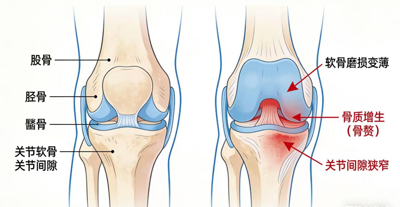 膝关节骨性关节炎(简称KOA)是中老年人高发的退行性关节病,因膝关节软骨磨损、骨质增生、关节间隙变窄引发。膝关节由股骨、胫骨、髌骨及软骨、韧带构成,软骨如同“缓冲垫”,长期负重、磨损或损伤后,会导致关节活动时骨头摩擦,引发炎症与疼痛。