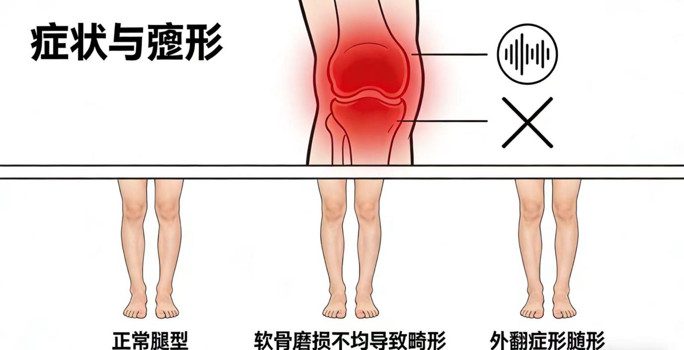 :晚期可能出现膝关节内翻(O型腿)或外翻(X型腿)畸形。