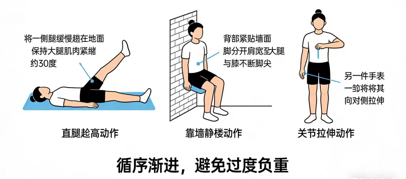 靠墙静蹲:背部贴墙,屈膝90°,保持30秒,每组5-10次,增强股四头肌力量;