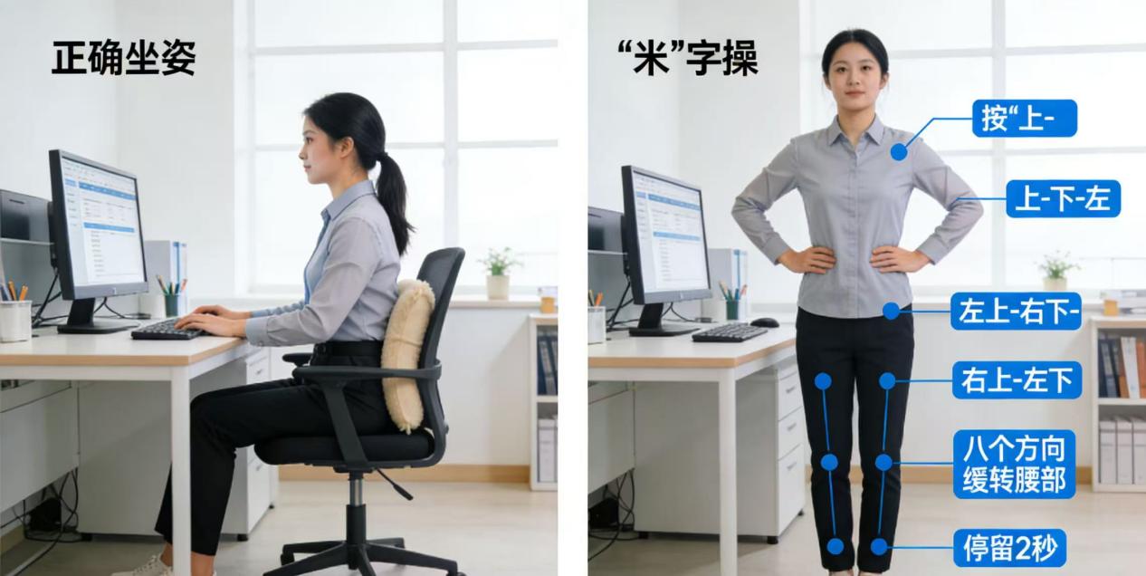 坐姿“黄金3点”:腰部贴椅背、膝盖与臀部同高、双脚平放,每40分钟起身活动;