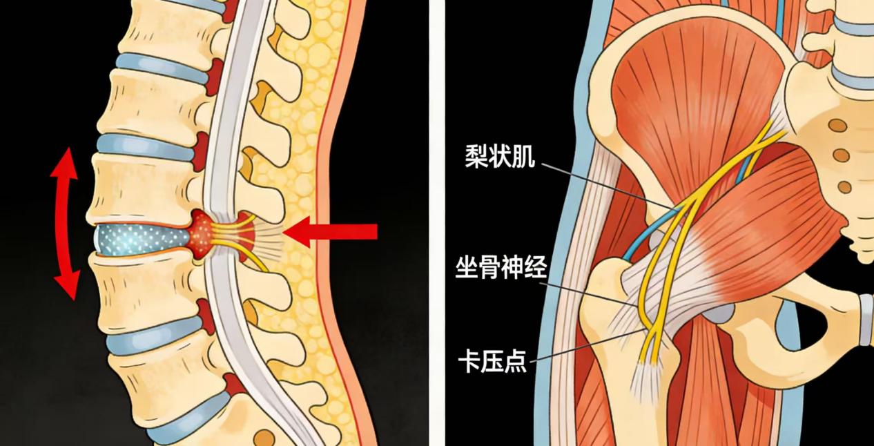 梨状肌综合征:久坐、运动不当导致梨状肌紧张/水肿,像“钳子”一样夹住坐骨神经;
