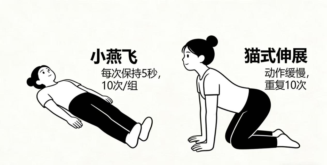 小燕飞:增强腰背肌,每次3组,循序渐进;