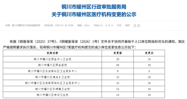 铜川市耀州区照金中心卫生院、耀州区永安路西城社区卫生服务中心等7家基层医疗机构申请将编制床位从139张减少至65张。其中,